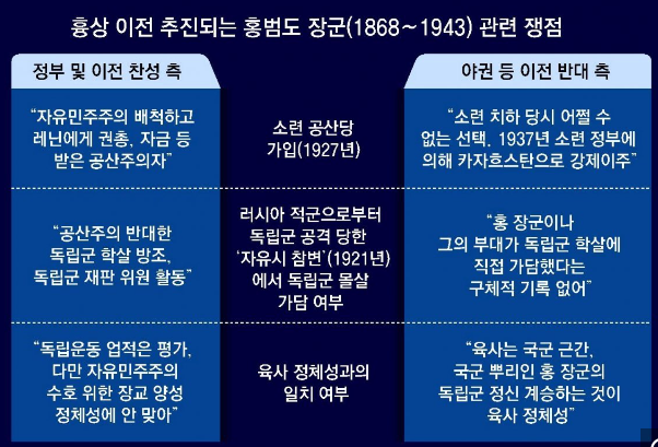 정부 여당이 육군사관학교에 설치된 홍범도 장군의 흉상을 독립기념관으로 이전하기로 한 것은 “소련 공산주의 세력과 손잡은 전력이 있는 인사의 흉상을 설치한 것이 부적절하다”는 정부의 이념적 단호함이 묻어나는 장면이다. 국방부는 이날 “북한 김일성이 소련 공산당의 사주를 받고 불법 남침해 6·25전쟁을 자행한 점을 고려할 때 소련 공산당 가입 및 활동 이력 등 논란이 있는 홍 장군의 흉상이 사관생도 교육의 상징적 건물인 충무관 중앙현관에 있는 것은 부적절하다”는 공식 입장을 밝혔다.