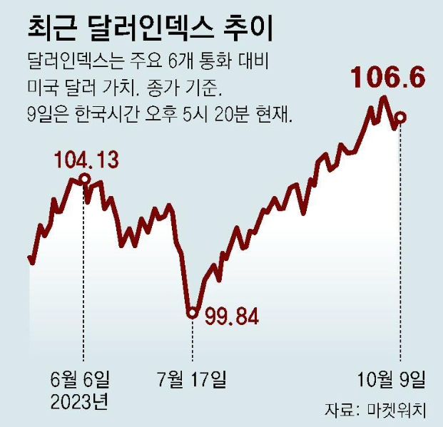 팔레스타인 무장단체 하마스와 이스라엘의 전쟁이 발발하면서 이미 올 들어 연중 최고치를 다시 쓴 국제유가의 불확실성이 더욱 커졌다. 안전 자산인 달러에 돈이 몰려 전 세계적인 ‘킹달러’(달러 초강세) 현상이 심화되면 고물가, 고환율이 장기화될 수 있다는 관측이 나온다. 아직까진 국내 원유 도입에 차질이 없는 상황이지만 자칫 무력 충돌의 범위가 넓어지면 한국 경제에 타격이 불가피하다.