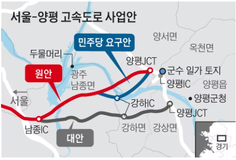 그 말 대로 라면 고속도로는 직선이 아닌 L 자에 가깝게 휘어지게 되는데, 이러한 주장을 가장 앞서서 펴는 민주당 소속