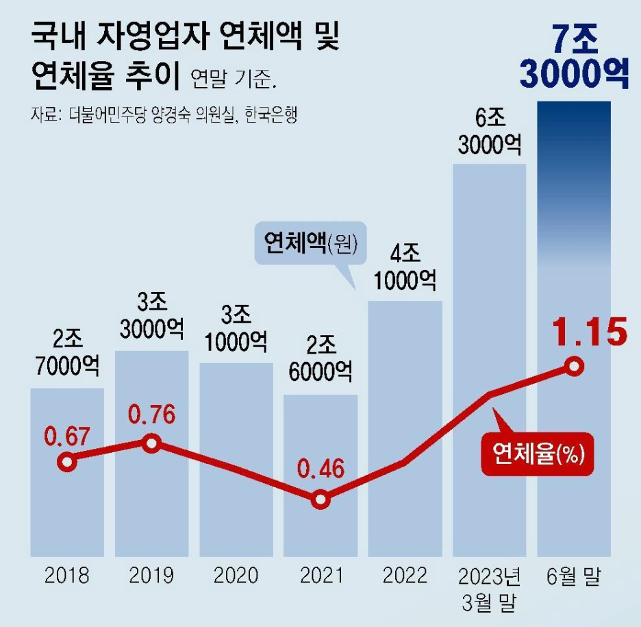 4일 더불어민주당 양경숙 의원이 한국은행으로부터 제출 받은 자료에 따르면 올해 6월 말 기준 자영업자의 전체 금융기관 대출 잔액은 1043조2000억 원으로 역대 최대를 갈아치웠다. 3개월 새 9조5000억 원 불었다. 특히 6월 말 자영업자의 대출 연체액은 역대 가장 많은 7조3000억 원으로 집계됐다. 연체액은 지난해 말 4조1000억 원에서 6개월 새 78.04% 급증했다.