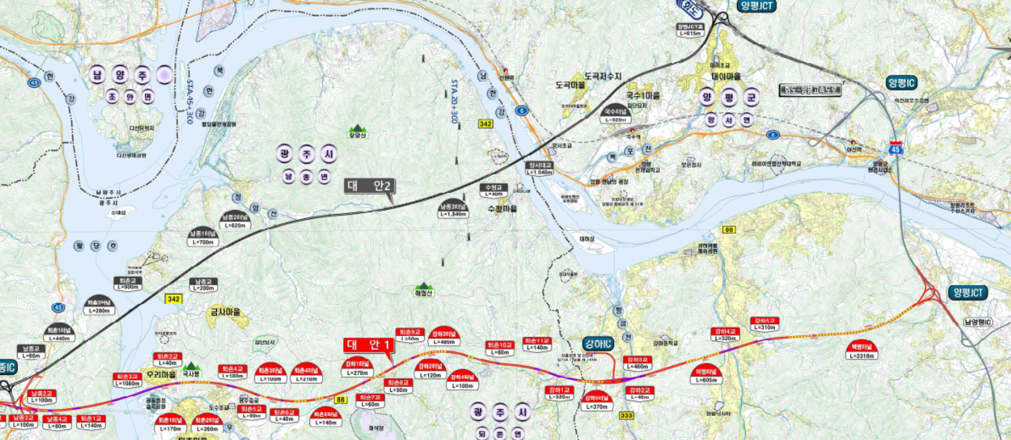 하지만, 대안 노선의 양평JCT 1km 안쪽에는 기존의 남양평 IC(나들목)이 있습니다. 남양평 IC가 사실상 대안노선의 나들목으로 쓰일 수 있는 겁니다.