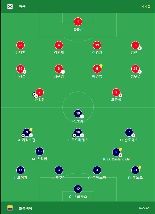 상대 콜롬비아의 점유가 떨어지고 패스성공률이 대한민국의 수치보다 낮은 것을 보면 대한민국의 압박의 강도가
