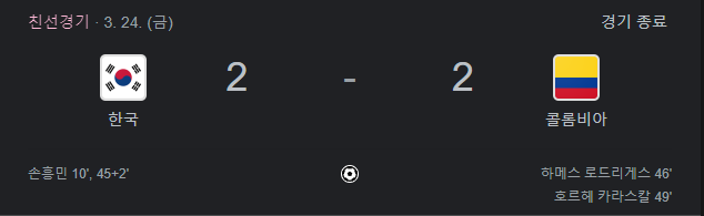 남미대륙에 전통강호 콜롬비아를 맞아서 열심히 싸운 대한민국이였다.