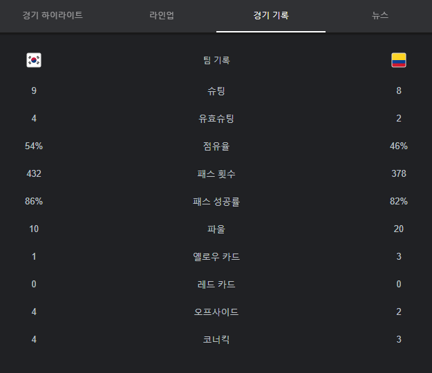 상대 콜롬비아의 점유가 떨어지고 패스성공률이 대한민국의 수치보다 낮은 것을 보면 대한민국의 압박의 강도가