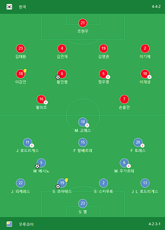 김민재가 버티고 있는 수비라인은 이번에도 실점에 맛을 보게 되었다. 실점과정에서도 우루과이 정교함보단 우리나라 수비 전술에 부재가 더 느껴지는 실점 부분이 두드러졌다.